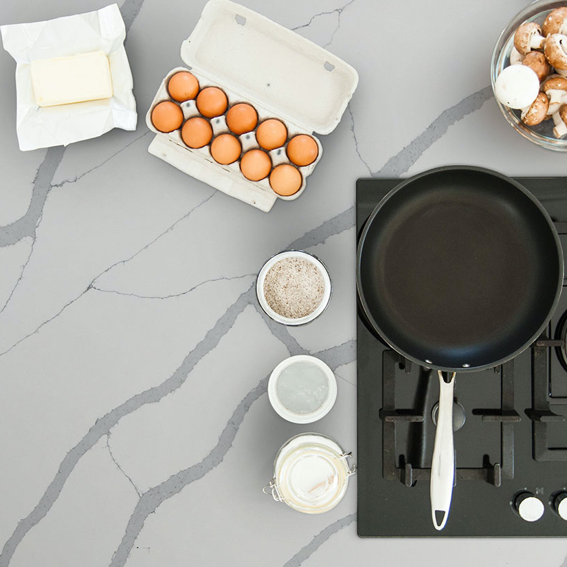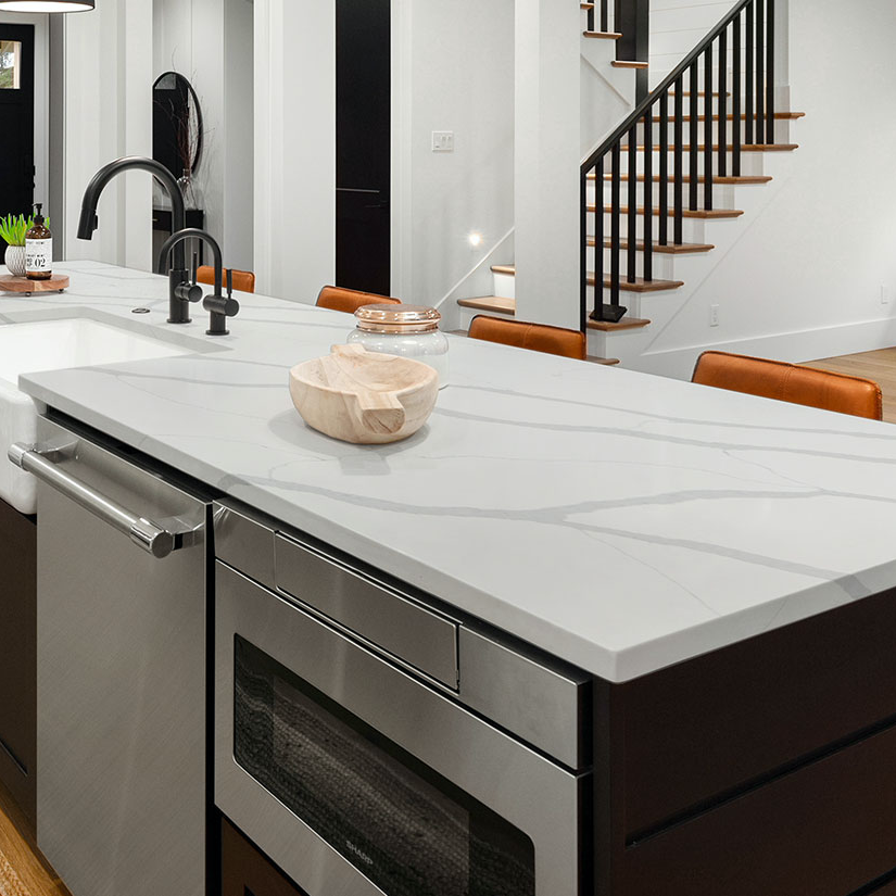 Naturally durable, maintenance free, and available in an endless array of designs and colors, Quartz surfaces are the perfect choice for any application. While quartz countertops are often called “engineered” or “man-made,” quartz is actually one of the hardest, most abundant natural elements. We combine high-quality, pure quartz with pigments and binder to create strong, compact slabs with unsurpassed performance.